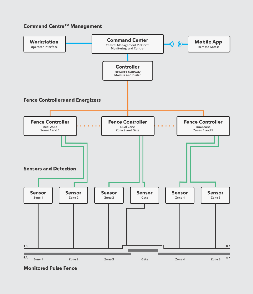 This system diagram illustrates how Gallagher’s perimeter security components work together to create a unified defense solution. From the physical fence line with its energized wires and intelligent sensors, through the network of controllers and communication systems, to the centralized command center – every element is designed for seamless integration and reliable performance.